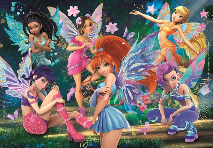 Detské puzzle s motívom WINX od značky CLEMENTONI ponúka 104 dielikov pre zábavné skladanie a rozvoj jemnej motoriky. Po zložení má obrázok rozmery cca 38 × 27 cm, ideálne na rámovanie alebo opakované skladanie.