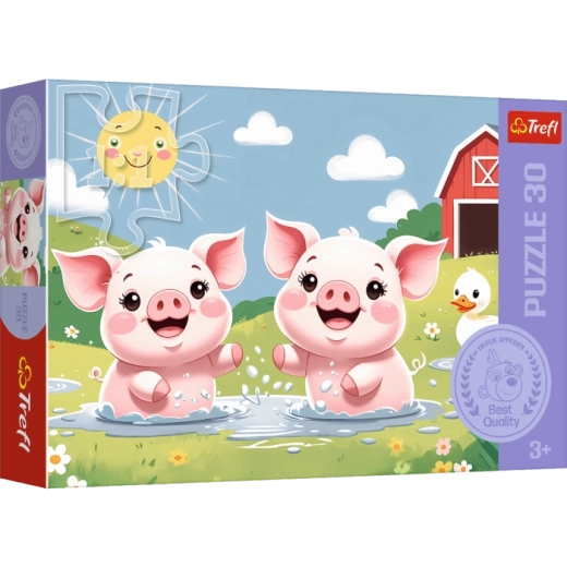 Objavte rozkošné puzzle Trefl „Veselý život na vidieku“, ktoré nadchnú všetkých malých milovníkov zvierat. Sada 30 dielikov po zložení vytvorí veselý obrázok s dvoma prasiatkami hrajúcimi sa v kaluži. Vďaka špeciálnemu kalandrovanému papieru sa dieliky príjemne lesknú a ľahko spájajú.