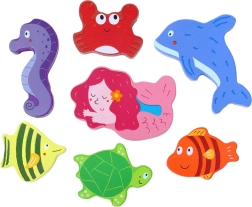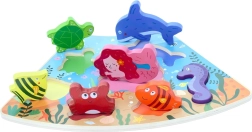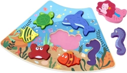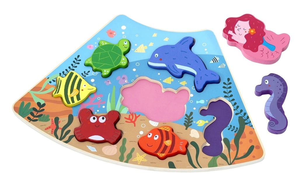 Objavte čaro oceánu s robustnou drevenou podložkou a 7 rôznymi dielikmi – korytnačka, delfín, morská panna, morský koník, krab a ďalšie rybky. Vďaka silným a hladkým dielikom sa puzzle skvele držia aj najmenším deťom a pomáhajú im trénovať vnímanie tvarov a trpezlivosť.