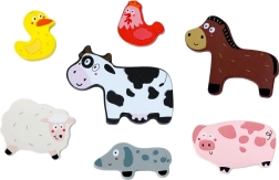 Sedem masívnych zvieratiek s obľúbenými farmárskymi motívmi podporuje istý úchop a trénuje koordináciu pri vkladaní do správnych tvarov.