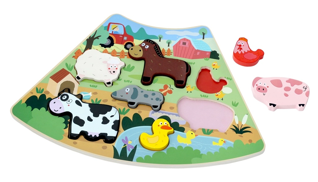 Drevené puzzle Veselá farma ponúkajú pevnú podložku s farebnou ilustráciou farmy a 7 masívnych, zaoblených dielikov zvieratiek (krava, ovečka, kôň, prasa, pes, kačka, sliepka). Silné dieliky sa deťom dobre držia a presne pasujú do vyfrézovaných otvorov, čo prirodzene podporuje rozvoj jemnej motoriky a sústredenia.
