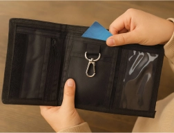 Zipsové vrecko na mince, priehradka na bankovky, priehľadné okienko na preukaz a háčik/karabína na kľúče zabezpečia poriadok a rýchly prístup.