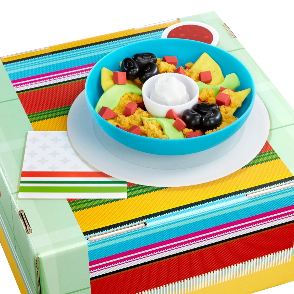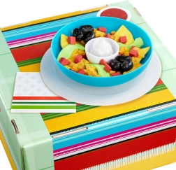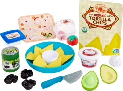 Táto farebná sada na prípravu „nachos“ prináša deťom zábavu do detskej kuchynky aj herne. Nájdú v nej misku, tanier a bohatý výber plastových ingrediencií – „tortilla chipsy“, avokádo, cherry paradajky, čierne fazule, syr či „kyslú smotanu“. Deti si tak ľahko nacvičia predstierané varenie, servírovanie aj spoločenskú hru pri stole.
