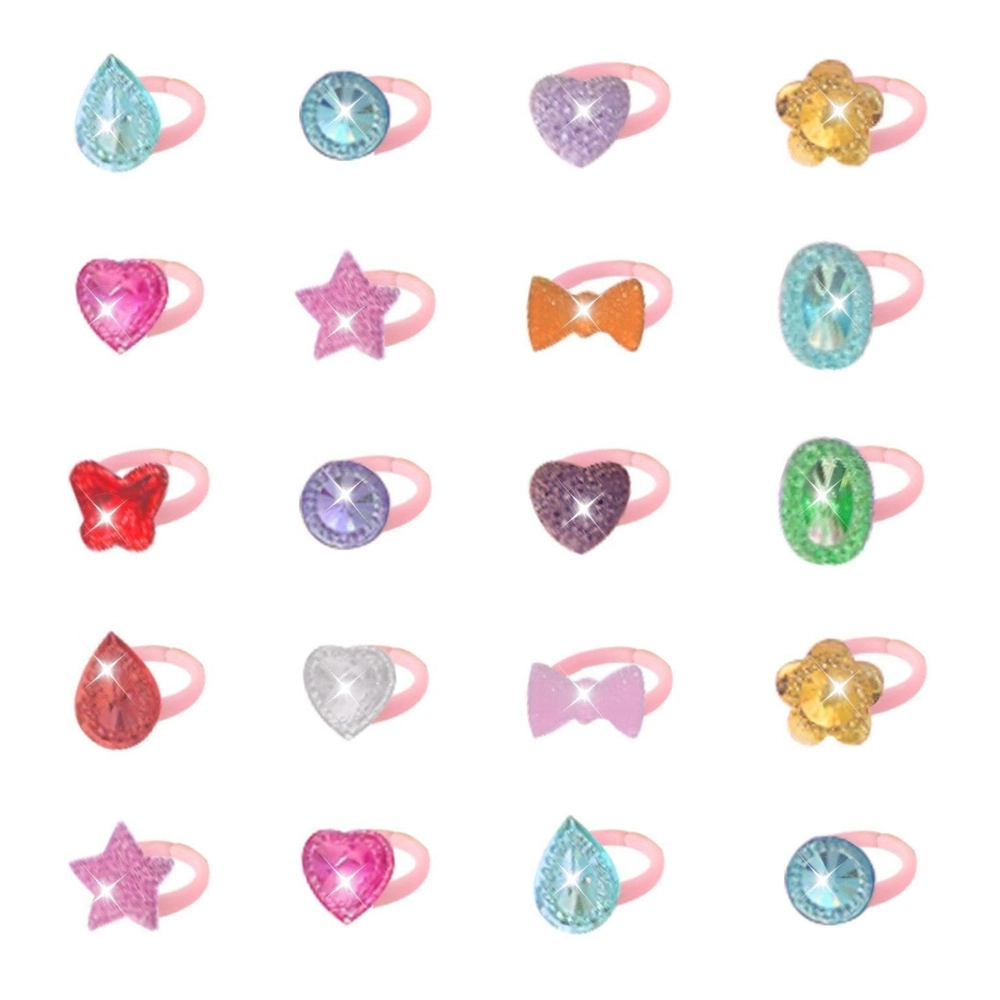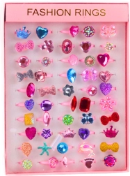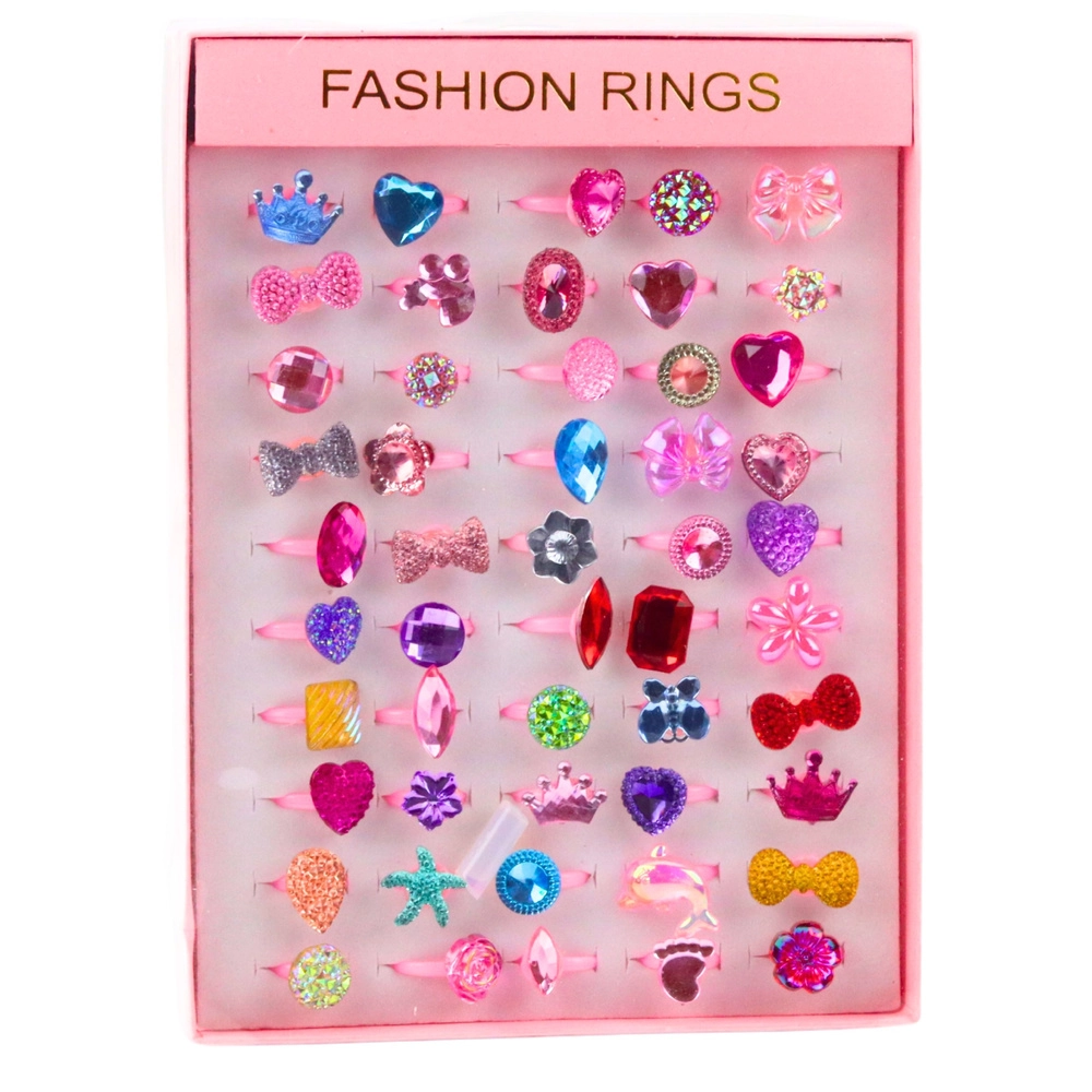 Herný set plný fantázie: 50 kusov farebných prstienkov s motívmi srdiečok, hviezdičiek, koruniek, mašličiek, kvietkov a veľkých „krištáľov“ poteší každú malú milovníčku bižutérie. Lesklé fazetové kamienky krásne odrážajú svetlo a dodajú každému kostýmu aj každodennej hre jedinečný trbliet.
