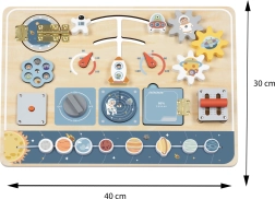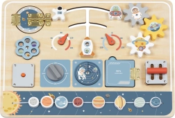Táto drevená vzdelávacia tabuľa prenesie deti do sveta kozmických objavov. Každý prvok – od prepínačov a pák až po otáčací radar – podporuje zvedavosť a sústredenie. Deti sa hrajú na ovládanie vesmírnej lode, sledujú „prístroje“ a učia sa prostredníctvom dotyku, pohybu a opakovania.