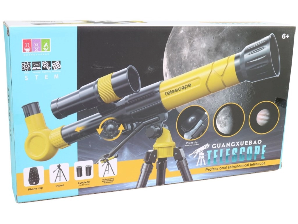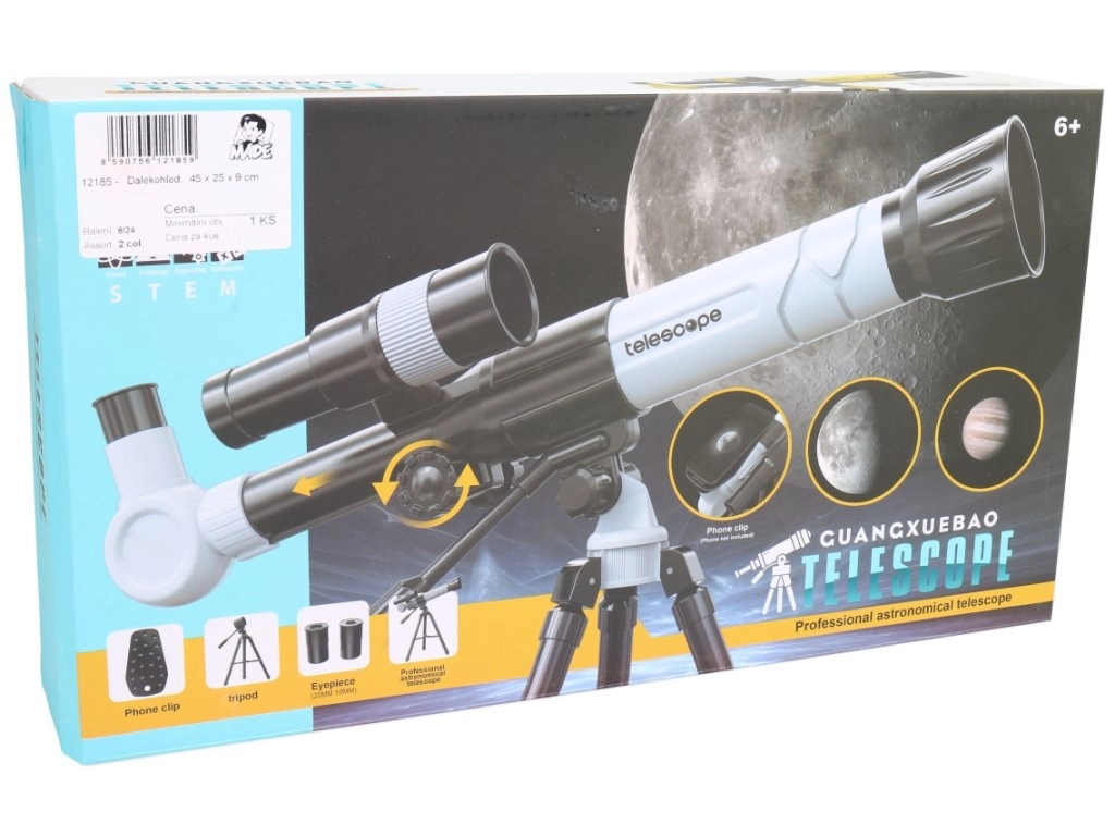Súčasťou je stabilný statív na pohodlné sledovanie a otočné koliesko na nastavenie ohniskovej vzdialenosti, ktoré uľahčí ostrý a čistý obraz. Praktický klip na telefón umožní pripevniť mobil a zachytiť snímky z vašich objavov.