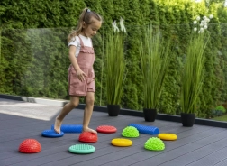 Senzorická stezka s 11 farebnými prvkami kombinuje kupoly, disky a polvalce s rôznymi textúrami pre pestrý tréning. Deti môžu preskakovať z „kameňa“ na „kameň“, rozvíjať stabilitu členkov, celkové držanie tela a hrubú motoriku, dospelí ju využijú na aktívne cvičenie rovnováhy aj masáž chodidiel.