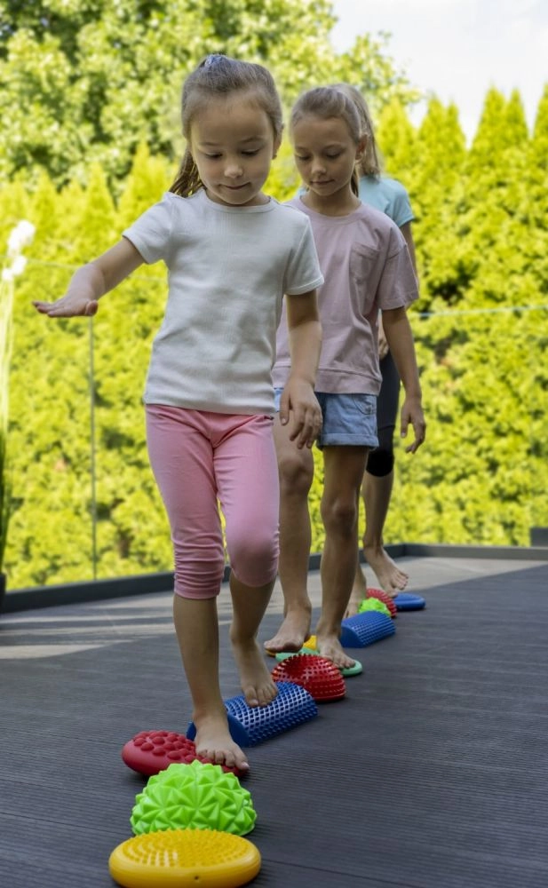 Vytvorte doma aj v škole zábavnú pohybovú dráhu so setom z 11 prvkov na rozvoj rovnováhy, koordinácie a zmyslového vnímania. Rôzne tvary a povrchy s výstupkami poskytujú taktilnú stimuláciu, podporujú hru formou hrania a ponúkajú protišmykový a bezpečný tréning naboso aj v ponožkách. Ideálne pre deti, fyzioterapiu aj senzorickú integráciu.