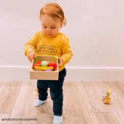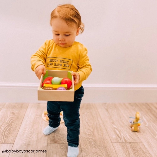 V tejto krabičke nájdete rôznorodé drevené ovocie, ako sú banány, jablká, jahody alebo hrušky. Pre deti je to skvelá hračka, ktorá ich nielen baví, ale zároveň ich aj vzdeláva o význame zdravej a vyváženej stravy. Hra je navrhnutá pre rozvoj jemnej motoriky a pri hre sa deti tiež učia, odkiaľ pochádza ich jedlo a ako sa pripravuje.
