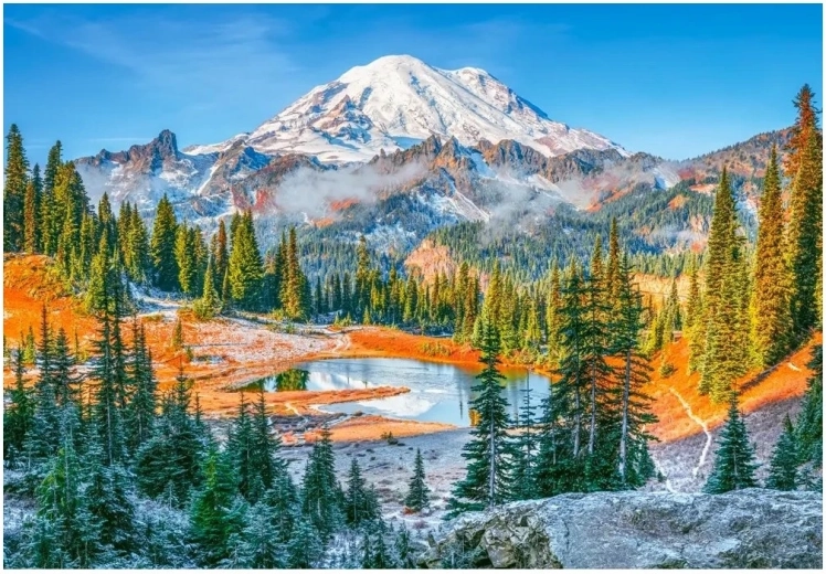 Objavte čaro majestátnej prírody s puzzle, ktoré zachytáva krásy Mount Rainier. Vďaka 1000 presne vyrezaným dielikom si vychutnáte zábavu aj oddych a výsledný obraz skvelo vynikne na stene alebo pod sklom.