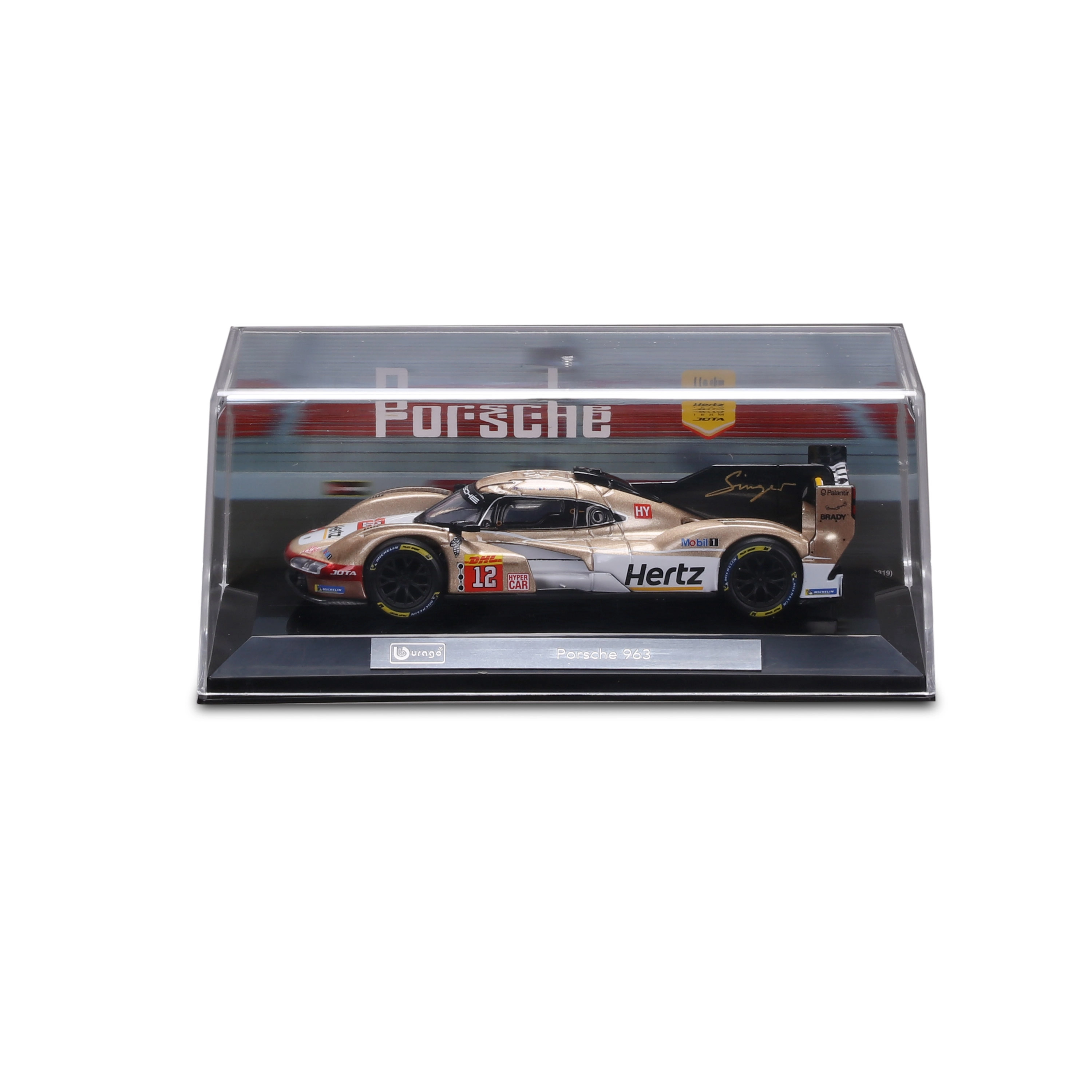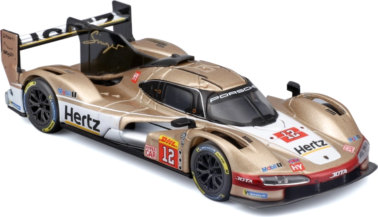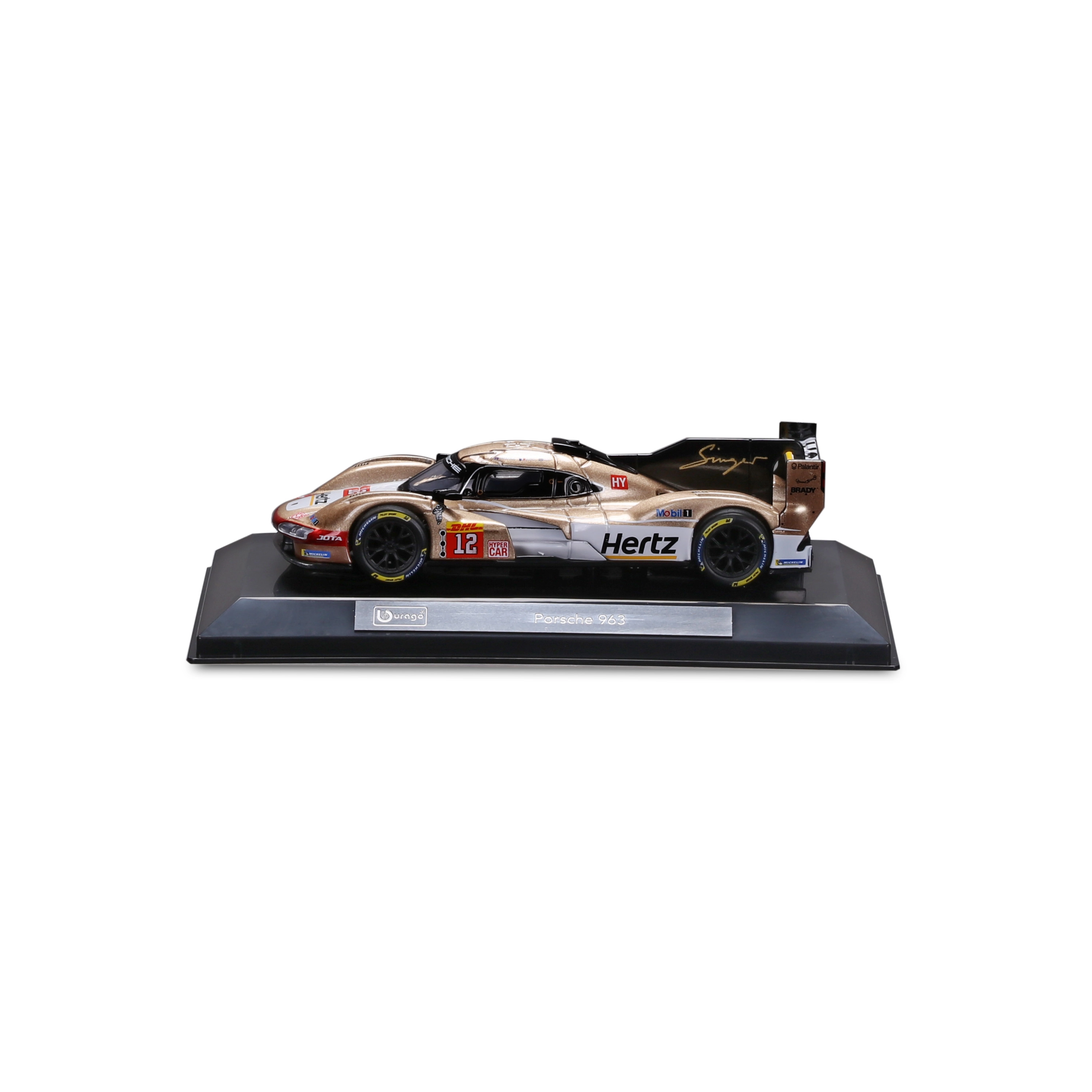 Tento vysoko detailný model Porsche 963 v mierke 1:43 prináša autentický vzhľad vytrvalostného špeciálu s oficiálnymi závodnými potlačami, realistickými proporciami a aerodynamickými prvkami vrátane výrazného zadného krídla a difúzora. Zlatobiela závodná farebnosť s logami sponzorov (napr. Hertz, Mobil 1, DHL) podčiarkuje špičkový závodný charakter.