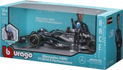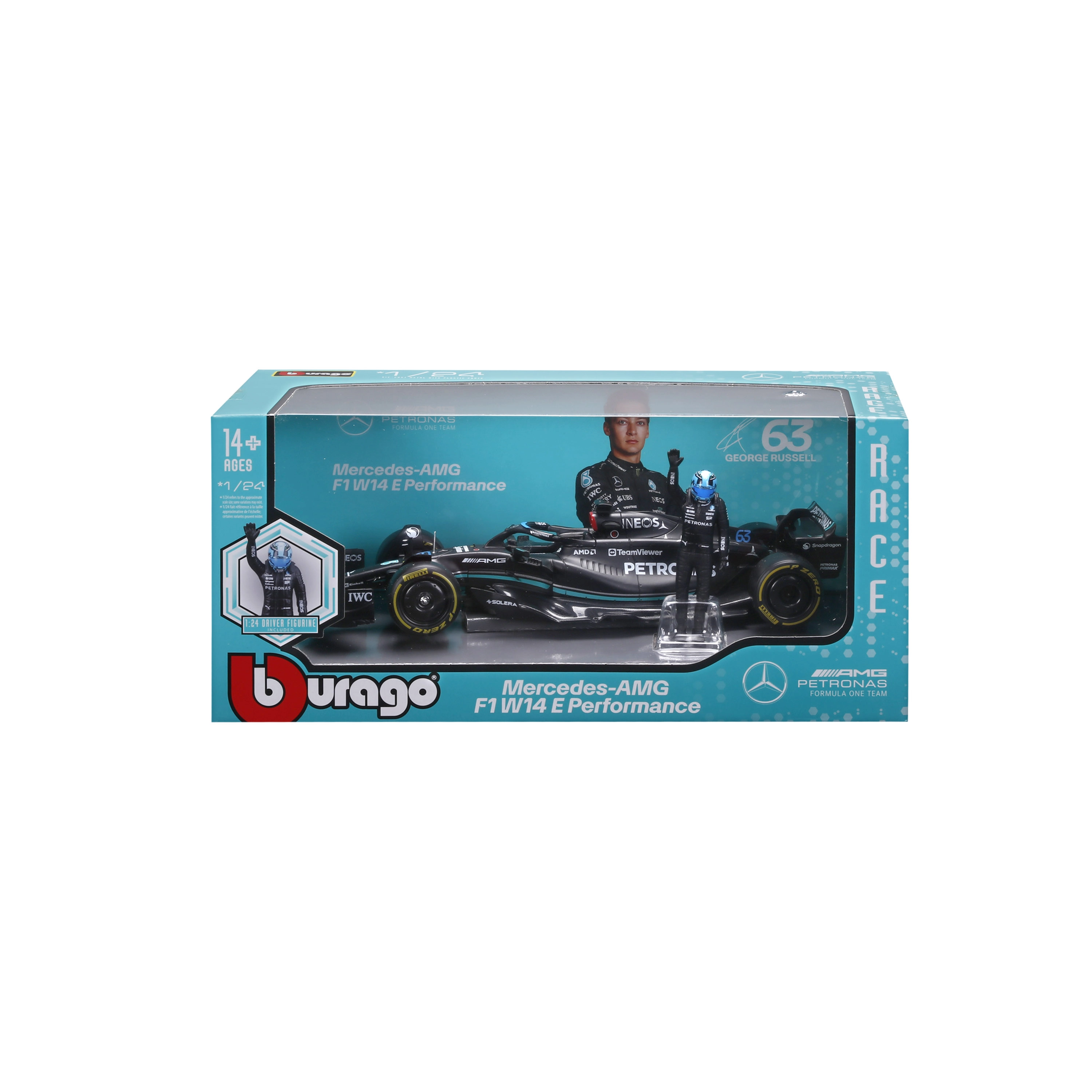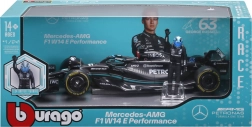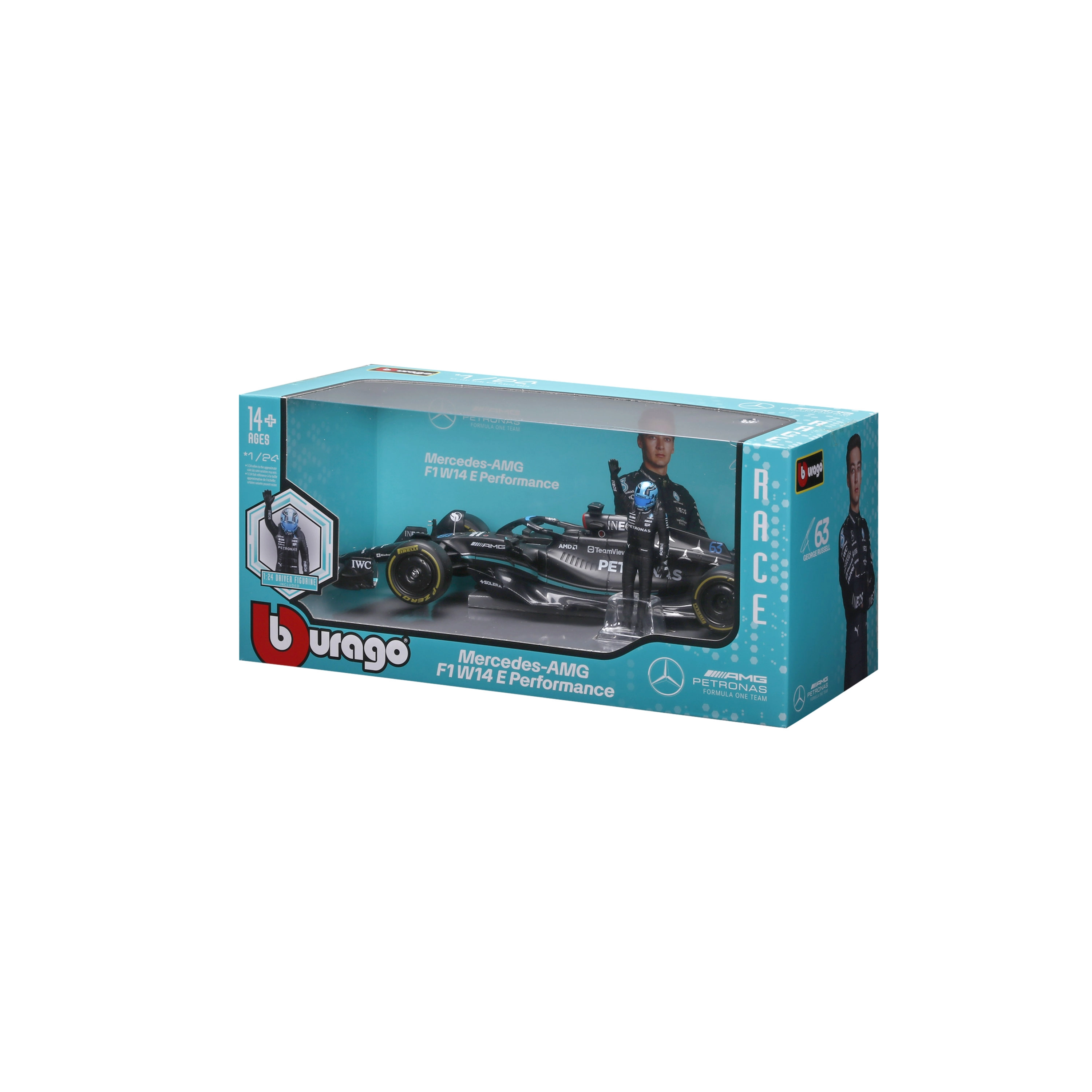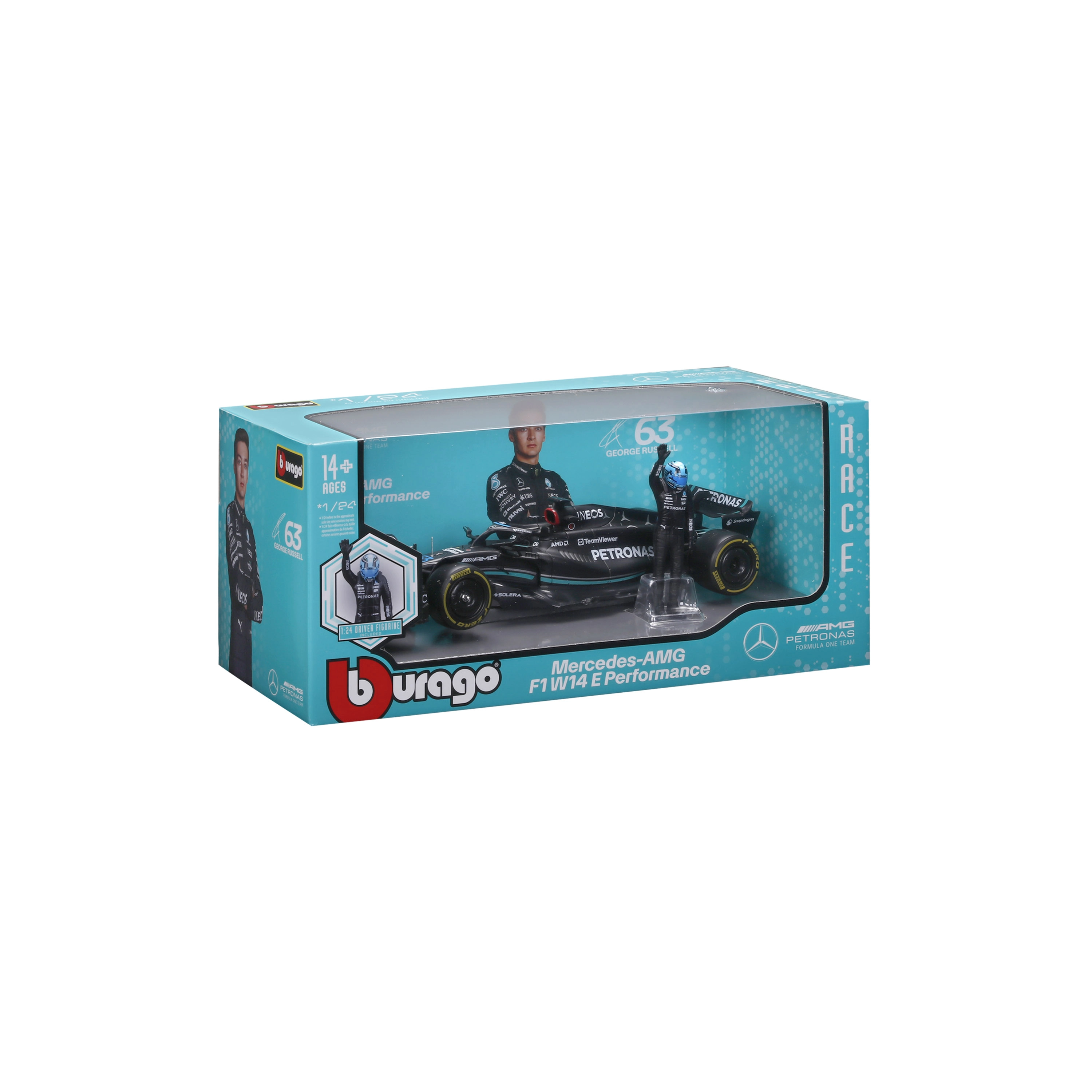 Detailný zberateľský model v mierke 1:24 verne zobrazuje voz MERCEDES‑AMG F1 W14 E (2023) s číslom 63 pilota GEORGE RUSSELL. Model ponúka precíznu potlač sponzorov, aerodynamické prvky, realistické pneumatiky a navyše figúrku jazdca na efektné vystavenie.