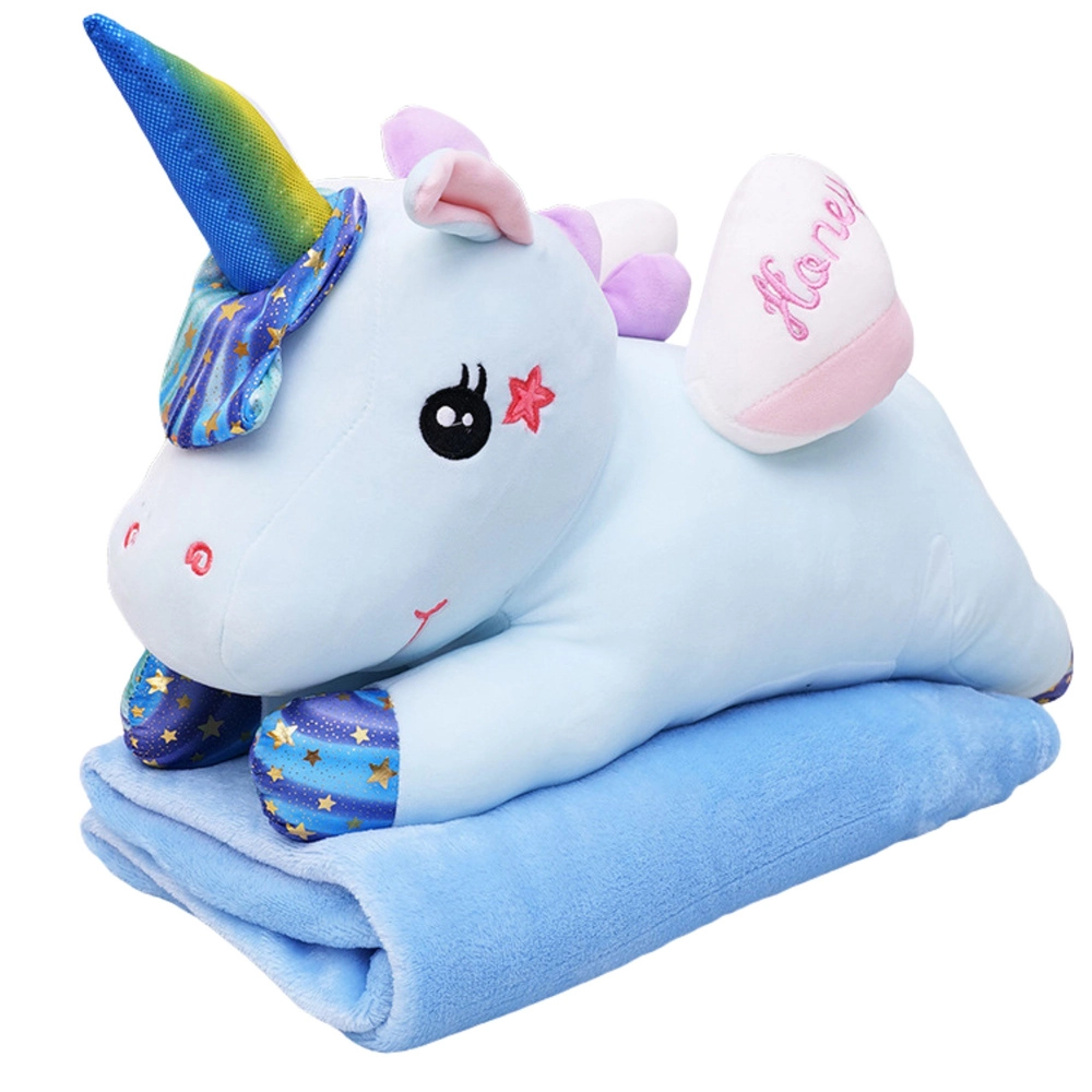 Roztomilý plyšový jednorožec 3v1 je zároveň maznáčik, vankúšik a teplá deka v jednom. Vďaka veľkosti 55 cm skvele poslúži na túlenie, zatiaľ čo mäkká deka 160 × 110 cm ukrytá v brušku sa postará o pohodlie pri spánku, odpočinku aj na cestách. Jemný, na dotyk príjemný plyš je šetrný k detskej pokožke a modré prevedenie s dúhovými akcentmi dodá detskej izbe čarovnú atmosféru.