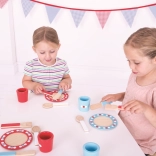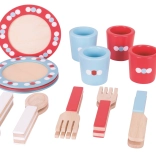 Táto farebná drevená jedálenská súprava je navrhnutá pre začínajúcich mladých kuchárov, ktorí chcú pripraviť vlastné večere a usporiadať čajové posedenia. Skvelý doplnok každej drevenej kuchynky na hranie, súprava obsahuje: