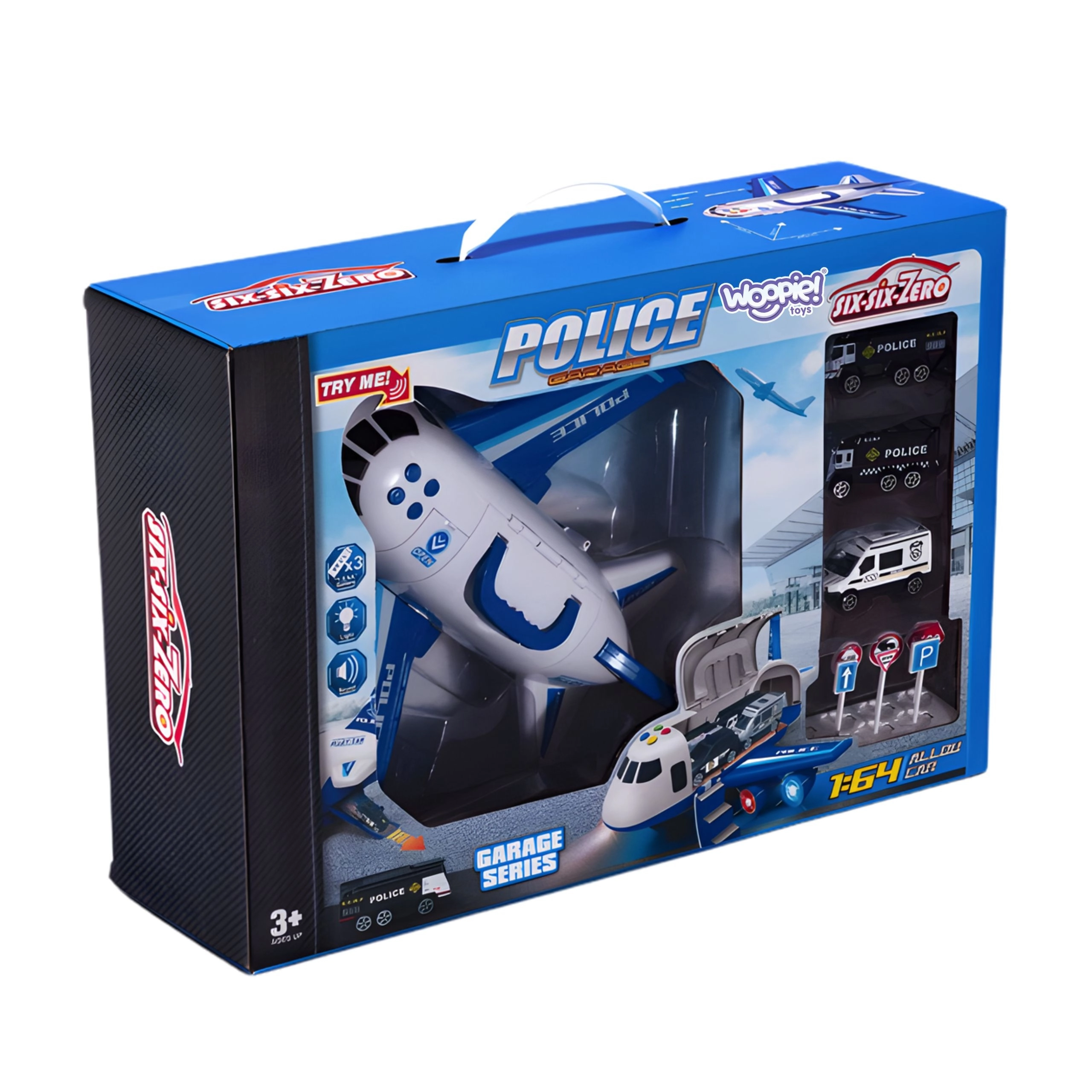 Objavte veľké policajné lietadlo–transportér WOOPIE, ktoré odvezie detskú fantáziu na akčnú misiu! Do priestranného trupu sa zmestia 3 policajné autíčka a sada značiek, nechýbajú svetelné a zvukové efekty so sirénami, otvárací trup a sklopná rampa ani praktické madlo na ľahké prenášanie.