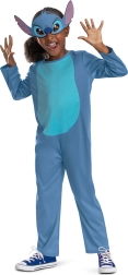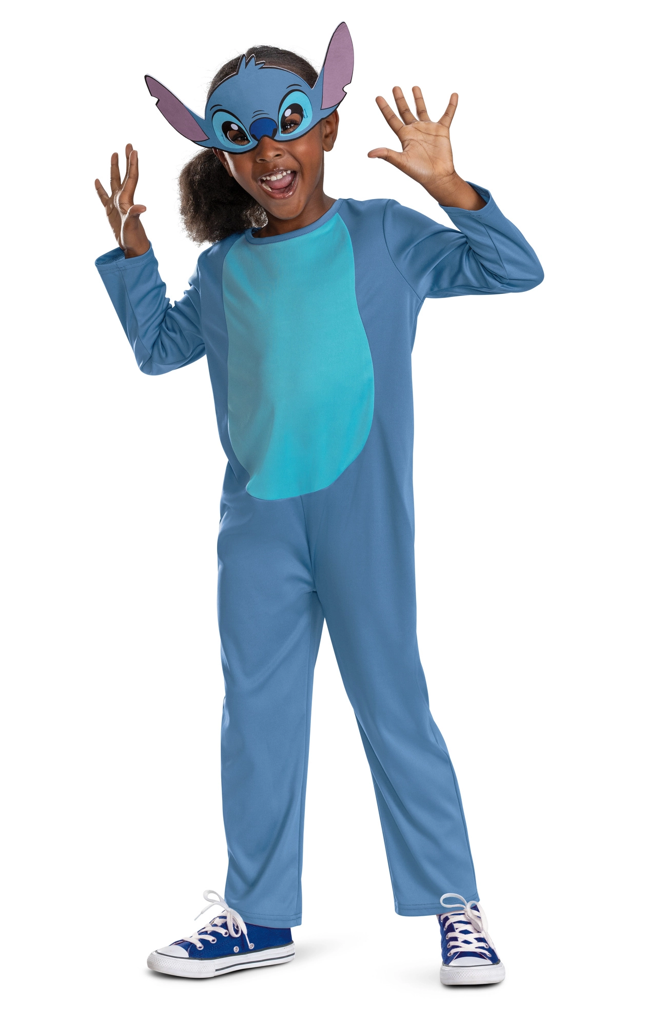 Modrá kombinéza so svetlým brušným panelom a charakteristickou maskou verne kopíruje obľúbenú postavičku z Lilo & Stitch.