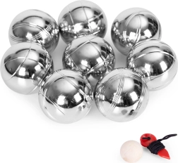 Súprava obsahuje 8 chrómovaných oceľových gulí s rôznymi líniovými vzormi pre jednoduché rozlíšenie hráčov. Každá guľa má priemer 72 mm a hmotnosť približne 700 g pre istý úchop a stabilný hod. Súčasťou je drevený jack a meracia šnúrka pre presné určenie, ktorá guľa je najbližšie – férová hra bez dohadov.