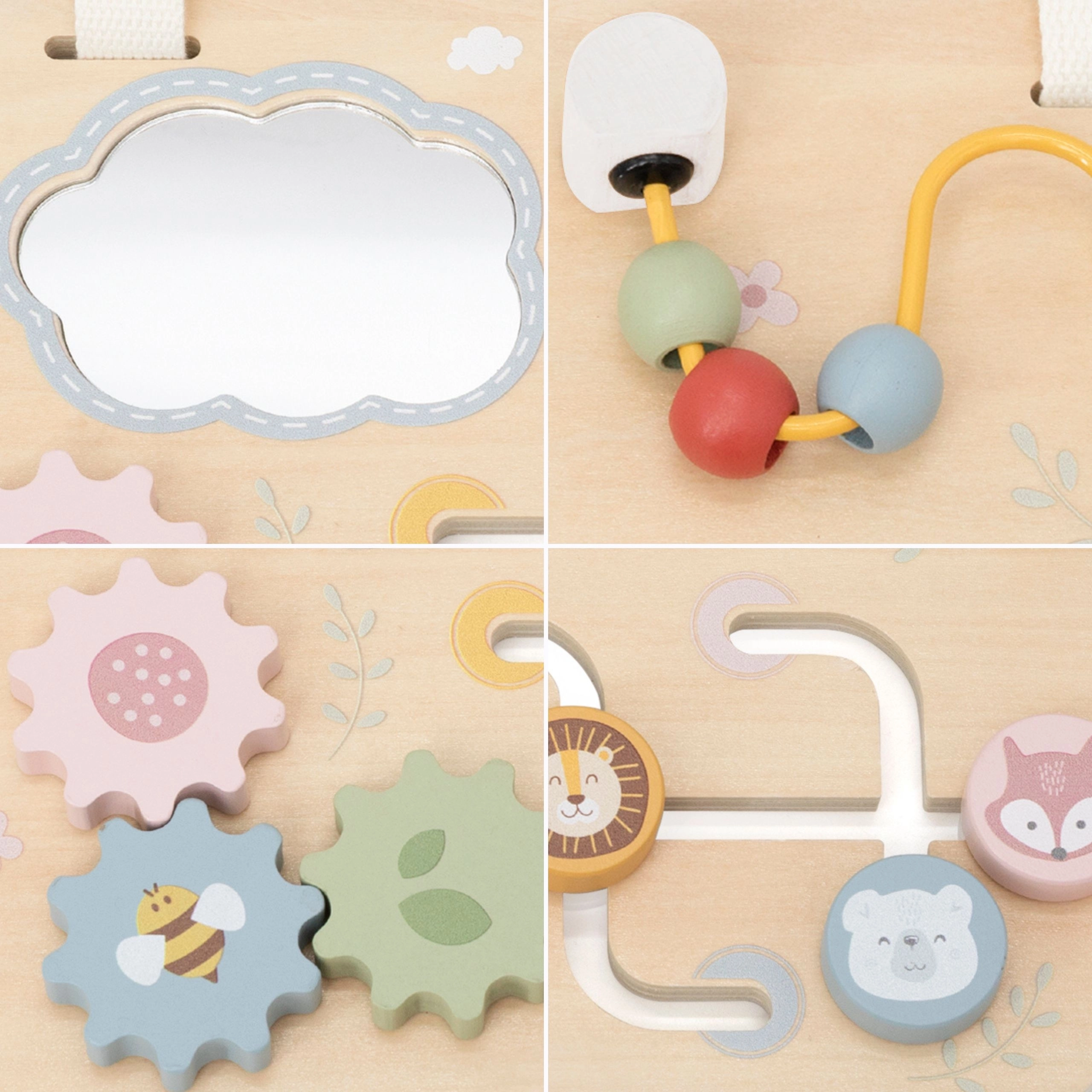 - Viac aktivít v jednom – zrkadielko, labyrint, ozubené kolieska a posuvník udržujú pozornosť dieťaťa.