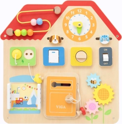Objavte čaro chytrej hry s drevenou tabuľou v tvare domčeka, ktorá deti láka k objavovaniu a precvičovaniu zručností. Premyslené prvky ako posuvníky, zámok s kľúčikom, ozubené kolieska či labyrint s korálikmi robia z tabule univerzálnu pomôcku na rozvoj motoriky, trpezlivosti a zvedavosti.