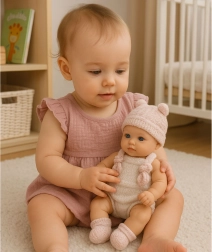 Roztomilé bábätko s výškou 18 cm s realistickými detailmi a pohyblivými končatinami poteší každé dieťa. Má mäkké, na dotyk príjemné telíčko, odnímateľné oblečenie a samo sedí, takže je ideálne na hru na starostlivosť a rozvoj fantázie. Súčasťou je čiapočka s uškami, ponožky, nohavice a podbradník s mašličkou.