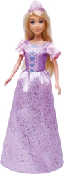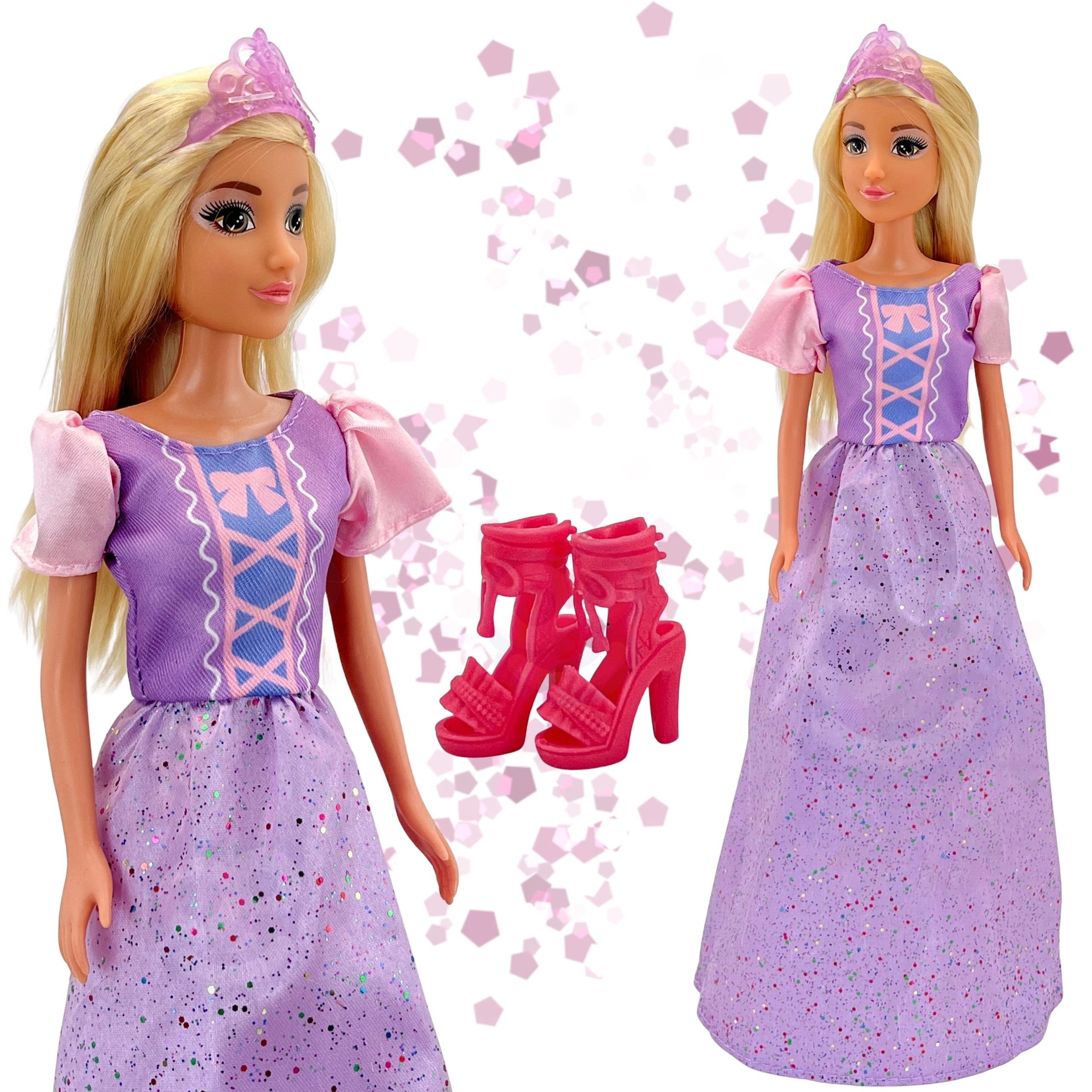 - Štýlová výbava: trblietavé fialovo‑ružové šaty, ozdobný živôtik, nafúknuté rukáviky a ladiaca tiara.