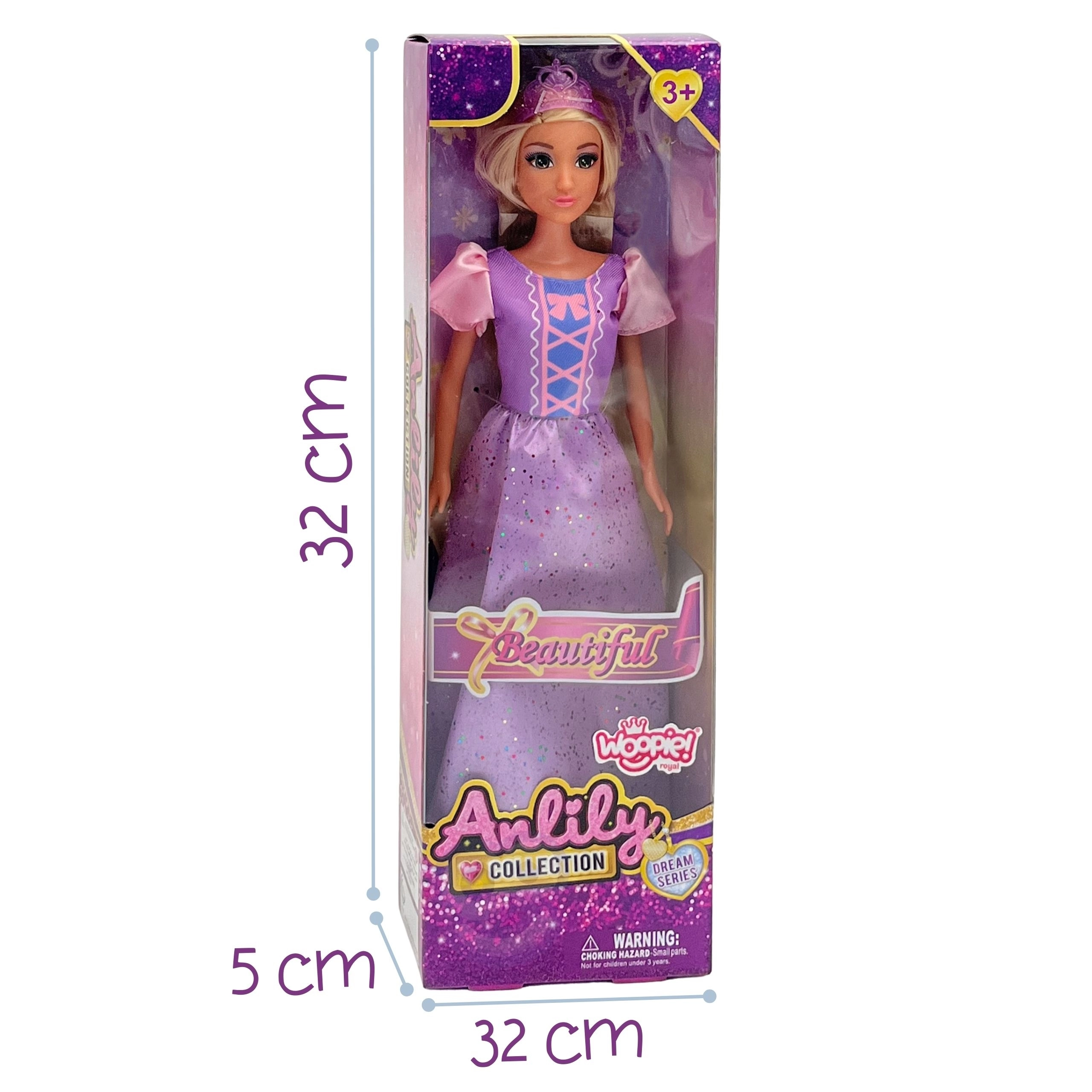 Kúzelná bábika Lily od značky Woopie očarí malé milovníčky rozprávok. Má dlhé blond vlasy na česanie a styling, nosí trblietavé fialovo‑ružové plesové šaty s nafúknutými rukávikmi a priesvitnú fialovú tiaru. Podporuje predstavivosť, role‑play a kreatívne príbehy. Vhodné pre deti od 3 rokov.
