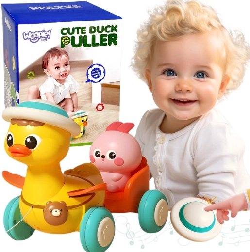 Roztomilá ťahacia kačička značky WOOPIE s ružovým zajačikom v prívesu poteší každé batoľa. Ponúka svetelné a zvukové efekty, pohyblivé krídelká pri jazde a bezpečné spracovanie s oblými tvarmi a pastelovými farbami. Stačí potiahnuť za šnúrku a kačička sa rozbehne, hrá veselé melódie a motivuje dieťa k chôdzi aj objavovaniu.