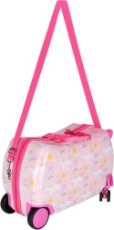 Konštrukcia kufra umožňuje dieťaťu pohodlne sedieť a nechať sa ťahať pomocou popruhu. Stabilné boky a opierky na nohy zvyšujú komfort aj bezpečie.