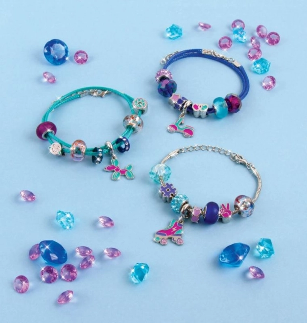 Sada obsahuje materiál na výrobu troch štýlových náramkov v modro‑fialových tónoch – ideálne na zdieľanie s kamarátkami alebo vrstvenie na ruke.