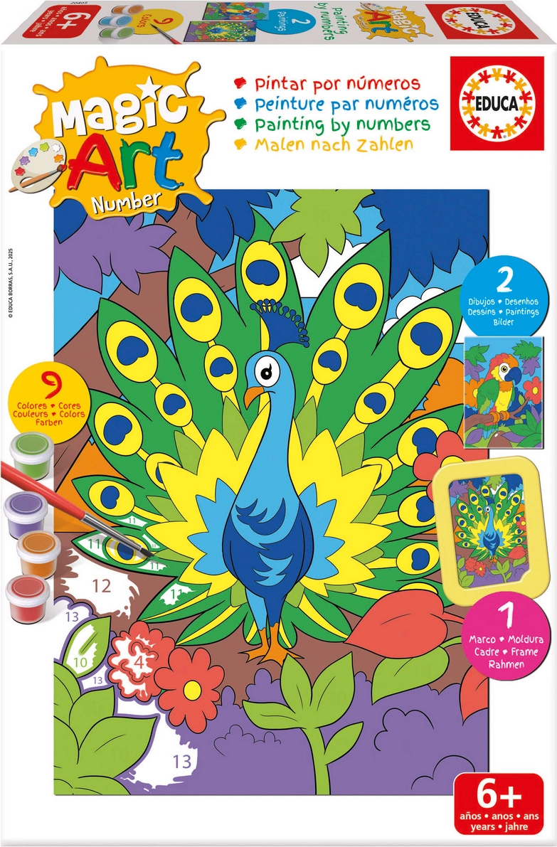 Objavte radosť z tvorby s kreatívnou sadou maľovanie podľa čísiel od značky Educa. Ľahko si namaľujete vlastné obrazy s motívmi páva a papagája, a to aj bez predchádzajúcich skúseností. Aktivita podporuje sústredenie, jemnú motoriku a rozpoznávanie farieb, zároveň je ideálna na relax aj zábavu.