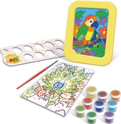2 obrázky s očíslovanými časťami, farebná predloha, sada 9 farieb so stojanom, plastový rámček na postavenie, štetec