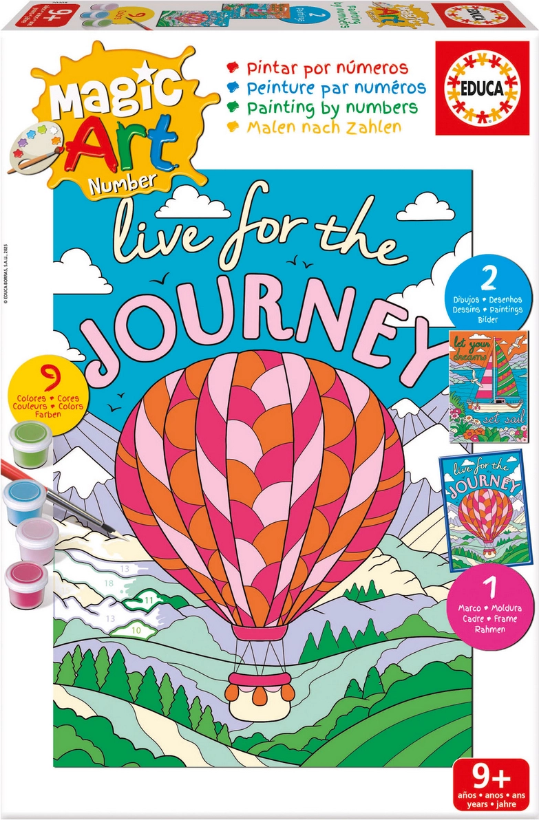 Táto kreatívna sada EDUCA premení maľovanie na jednoduchú a radostnú činnosť. Každé číslo na plátne zodpovedá konkrétnej farbe, takže ľahko vytvoríte pôsobivý obrázok lode aj horúceho vzduchového balóna. Súčasťou je všetko potrebné – od farieb až po rámik – takže môžete začať tvoriť hneď.