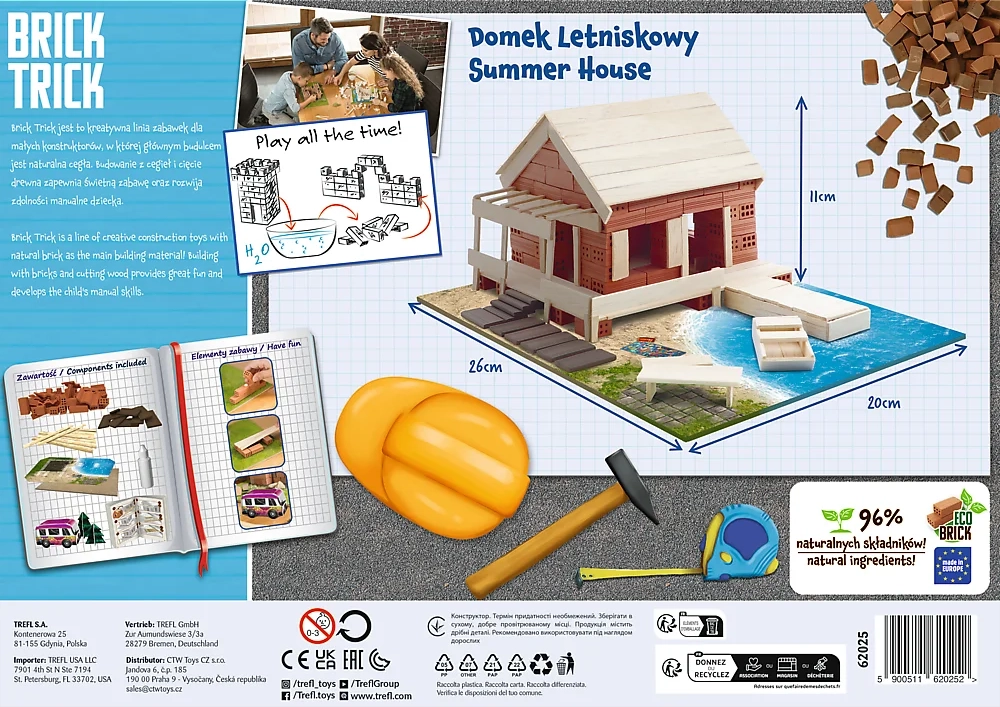 Objavte kreatívny svet stavieb s originálnou stavebnicou Trefl Brick Trick letné sídlo M. Z pravých hlinených tehličiek a drevených dosiek postavíte dom krok za krokom a vďaka rozpustnému lepidlu môžete stavať znova a znova. Sada rozvíja manuálne zručnosti, predstavivosť a sústredenie – ideálna zábava pre malých aj veľkých staviteľov.