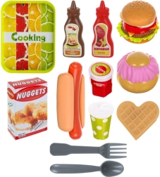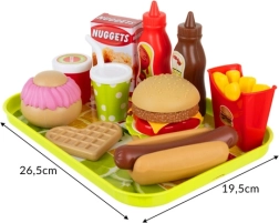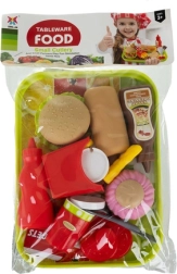 - tácka, kečup, čokoládová omáčka, rožok na hot dog, párok, príbory (lyžica, nožík, vidlička), nuggety, džem, kelímok so slamkou, krabička na hranolky, 5× hranolky, 2× žemle na burger, vafľa, cibuľa, šalát, paradajka, karbonátok, syr, cupcake, poleva