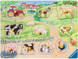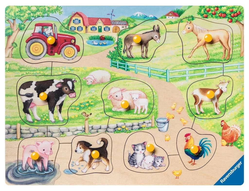 Drevená vkladačka Ravensburger zo série Moje prvé drevené puzzle prináša deťom radosť z učenia hrou. Desať pevných dielikov s láskavo ilustrovanými motívmi z farmy pomáha rozvíjať kľúčové zručnosti a podporuje správny úchop vďaka plastovým úchytkám na každom dieliku.