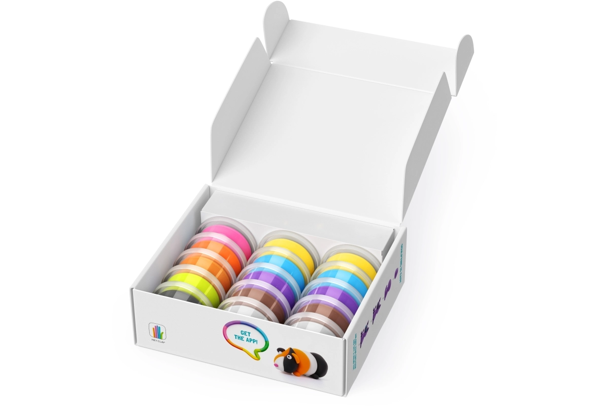 - 15 kelímkov modelovacej hmoty, prístupový kód do aplikácie HEY CLAY