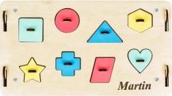 - Tabuľa, vkladacie puzzle, zipsy, suchý zips, dotyková lampa, budík, tlačidlá, motorické prvky, okná a dvere