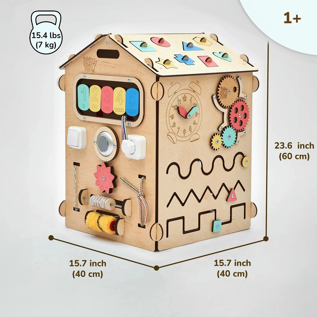 Objavte montessori aktívny domček BusyKids v prírodnom prevedení – odolnú, ekologickú a ručne vyrábanú hračku, ktorá rozvíja jemnú motoriku, kreativitu a logické myslenie detí. Ponúka množstvo interaktívnych prvkov (zipsy, suchý zips, tlačidlá, budík, puzzle, tabuľa) a je vhodný pre deti od 1 roka. Vyrobený z kvalitnej brezovej preglejky s bezpečnými lakmi na vodnej báze, bez skrutiek, s nitovanými spojmi a certifikáciou CE a EN 71.