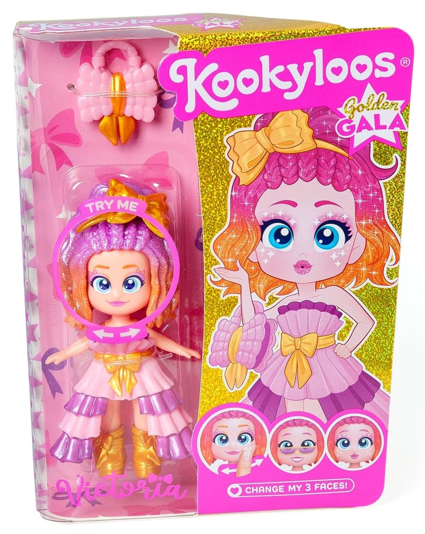 Figúrka KookyLoos Victoria Golden Gala kombinuje módny štýl, výraznú osobnosť a precízne spracované detaily. Otočením hlavičky ľahko zmeníte 3 rôzne mimiky, čo rozširuje možnosti hry, rozprávania príbehov aj vystavenia v zbierke.