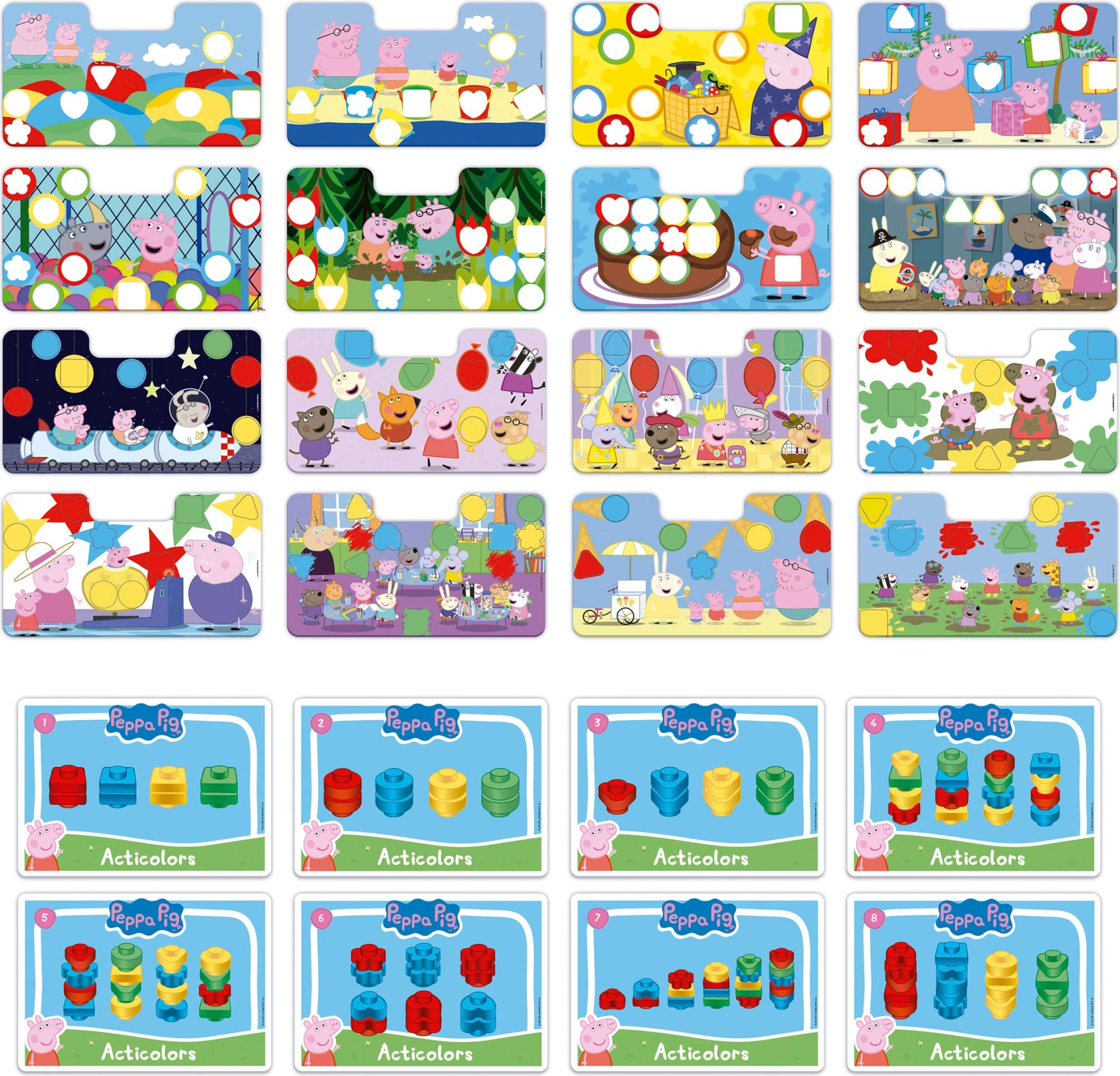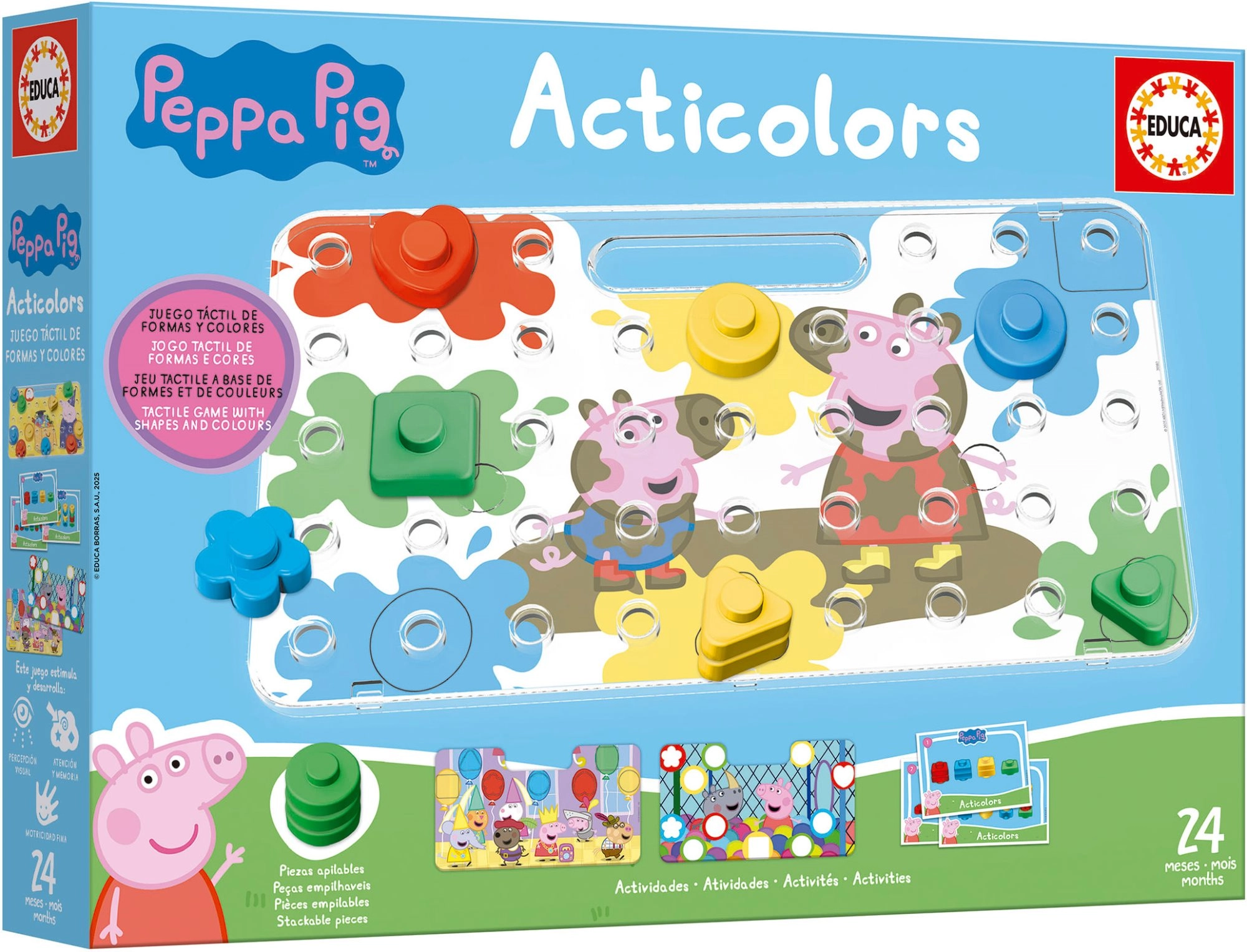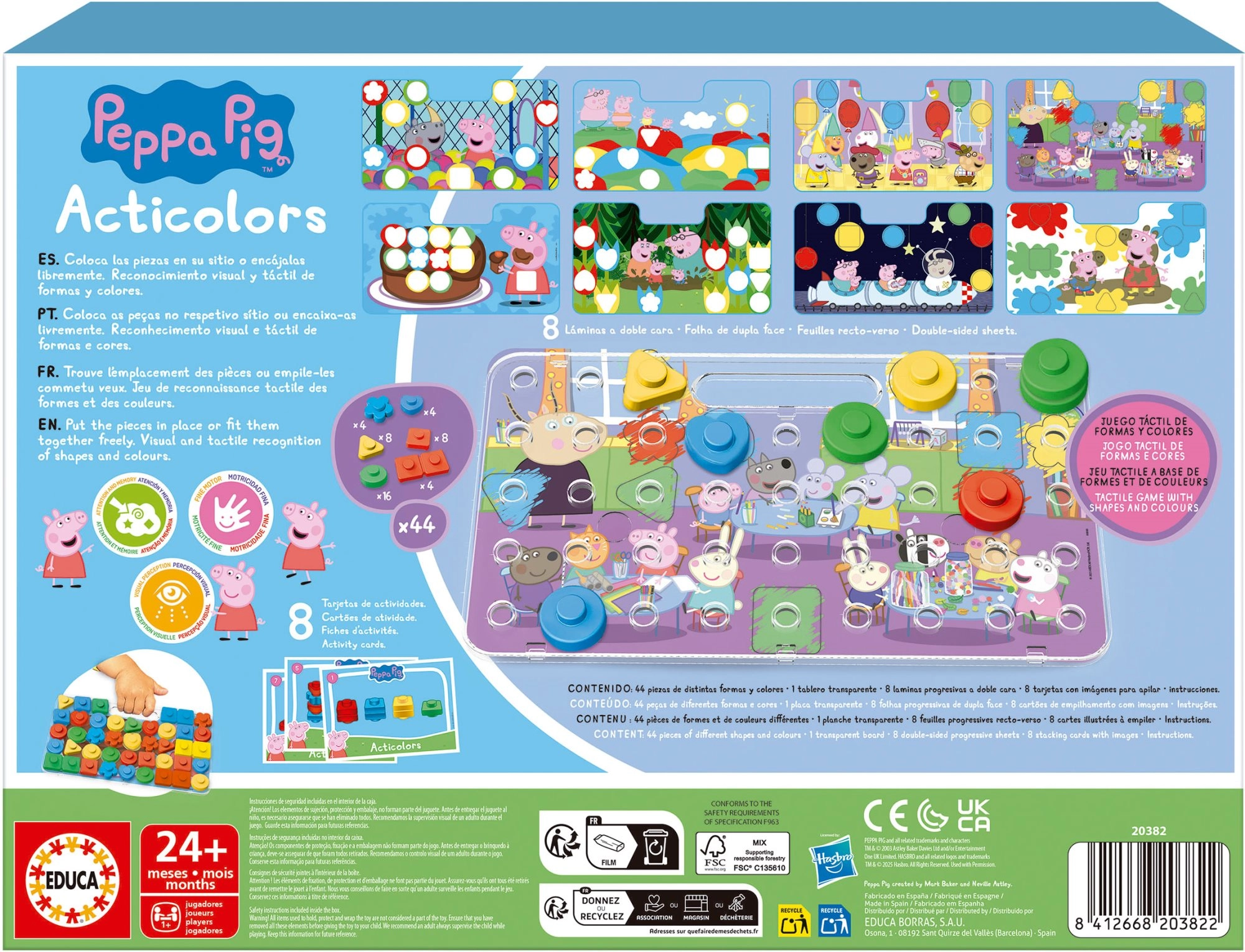 Hravá didaktická sada EDUCA Acticolors s motívom PRASIATKO PEPINA učí deti základné farby a tvary zábavnou formou. Rozvíja jemnú motoriku, vizuálne vnímanie a priestorovú orientáciu. Ponúka 3 herné varianty na udržanie pozornosti a radosť z objavovania. Súčasťou je plastová podložka s držadlom, 8 obojstranných predlôh a 44 dielikov v rôznych tvaroch a farbách. Ideálne pre deti 2–4 roky.