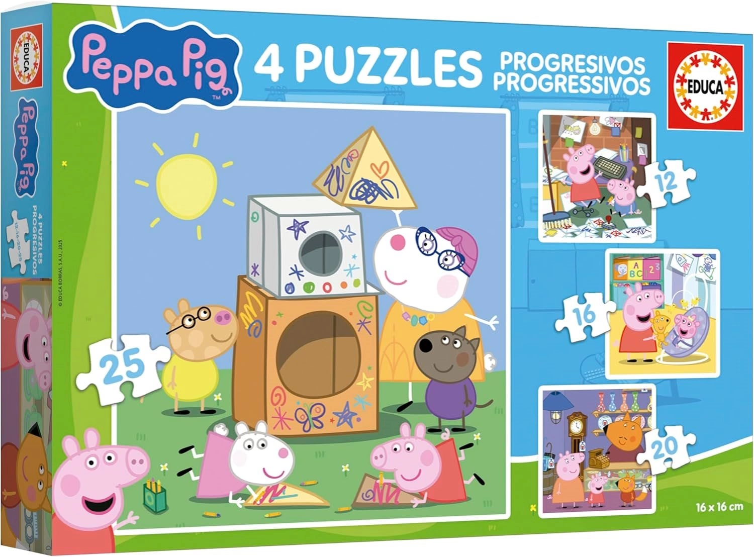 Objavte zábavnú sadu štyroch progresívnych puzzle s motívom PRASIATKO PEPPA od značky Educa. Každé puzzle má iný počet dielikov (12, 16, 20 a 25), takže sa skvele hodí na postupné zdokonaľovanie detí. Kompaktný rozmer 16 × 16 cm je ideálny na cestovanie aj domáce hranie.