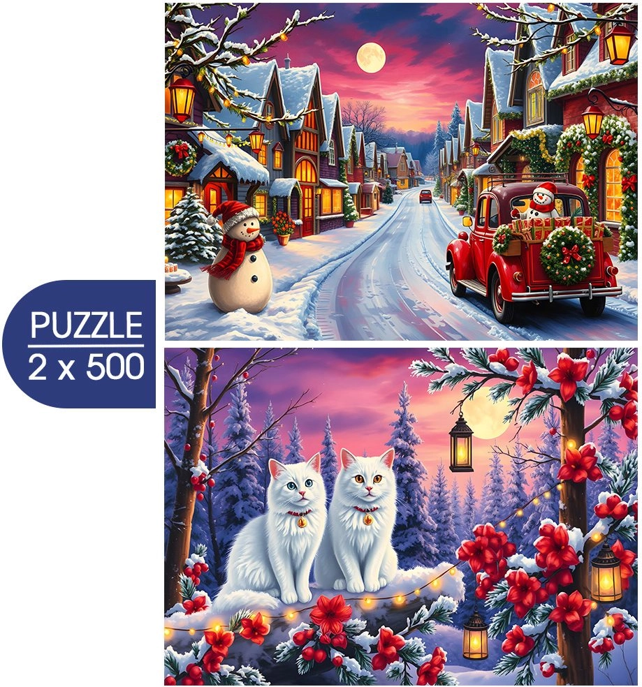 Objavte kúzlo Vianoc s dvojicou puzzle BLUEBIRD, ktorá prináša dve nádherné zimné ilustrácie po 500 dielikoch. Každý hotový obrázok má rozmer približne 47,8 × 34,2 cm, takže sa skvele hodí na zarámovanie alebo ako dekorácia do interiéru.