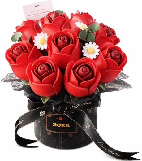 - Realistický vzhľad ruží a štýlový čierny box ROKR s mašľou