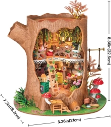 Vstúpte do sveta fantázie a vytvorte si vlastnú Lesnú chalúpku z pňa – dvojposchodový mini domček s dreveným nábytkom, kuchyňou, spálňou, dekoráciami, hubovou záhradkou a vonkajšou hojdačkou. Po rozsvietení LED svetiel sa model zmení na okúzľujúcu expozíciu a stane sa stredobodom pozornosti každej poličky.