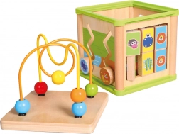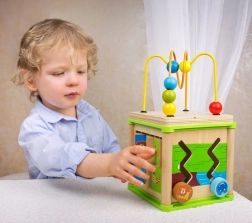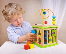 Táto multifunkčná motorická kocka spája päť obľúbených aktivít: vkladanie tvarov, súkolie so ozubenými kolieskami, kľukaté vodiče s posuvnými dielikmi, priraďovanie zvieratiek k ich potrave a horné korálkové bludisko. Každá strana kocky je navrhnutá tak, aby podnecovala koordináciu ruka–oko, trpezlivosť a sústredenie.