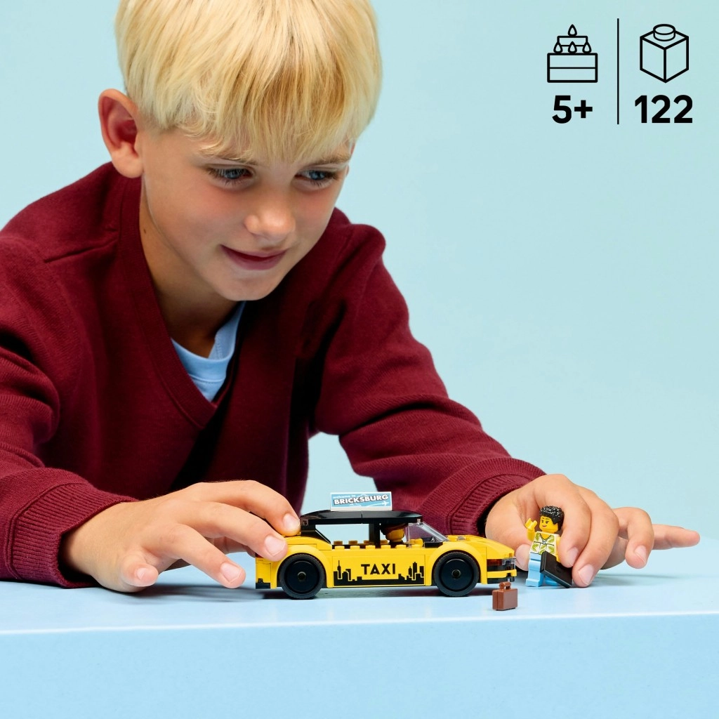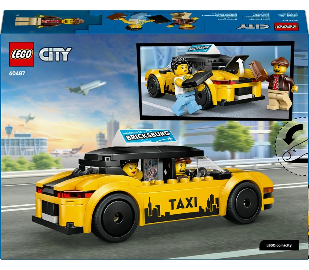 Žlté prevedenie s čiernymi pruhmi, nápisom TAXI a reklamným panelom „Welcome to Bricksburg“ dodáva modelu realistický vzhľad do každej scény LEGO City.