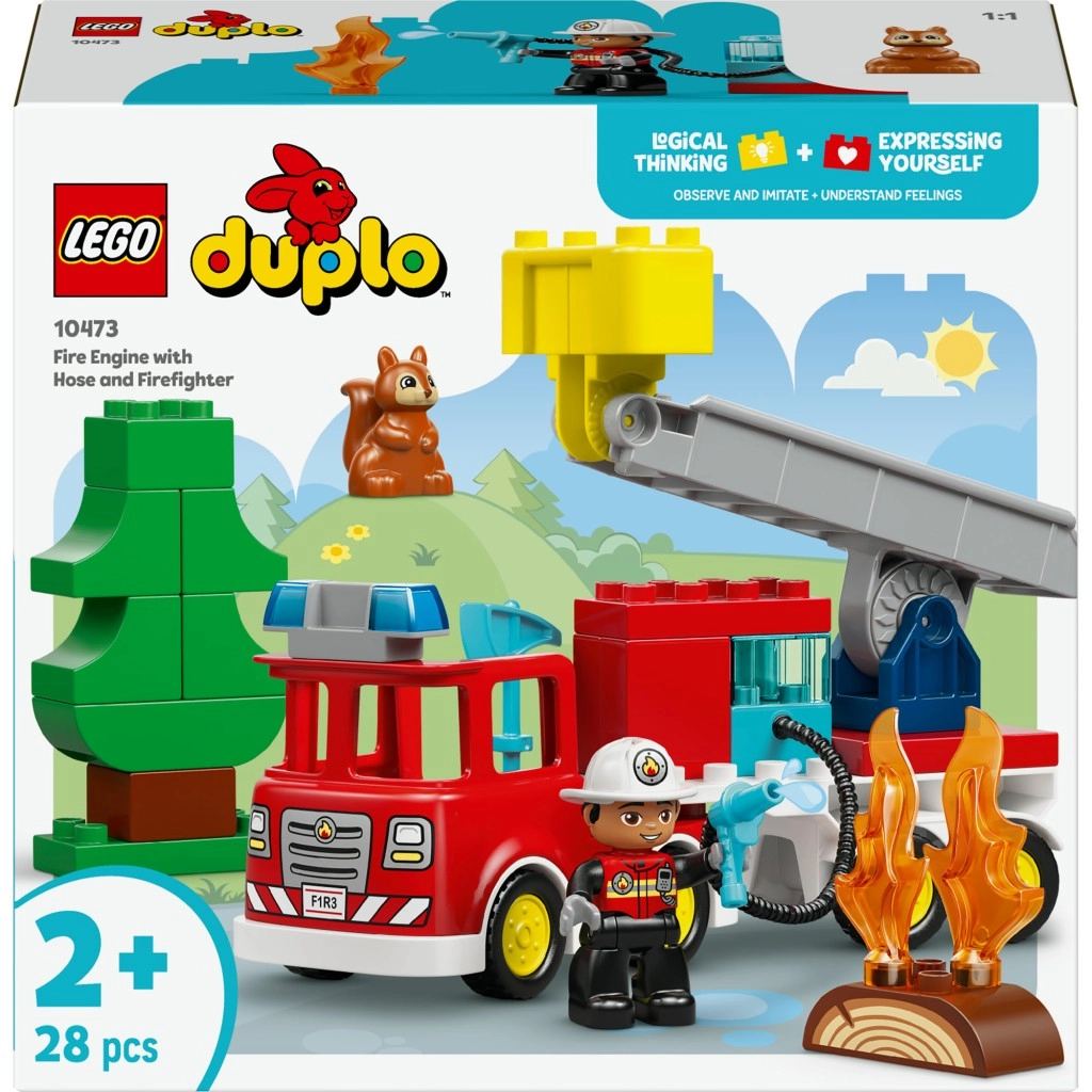 Objavte zábavné LEGO DUPLO Hasičské auto s hadicou a hasičom pre najmenších. Stavebnica pre deti od 2 rokov prináša červené hasičské auto so sklopným rebríkom a ohybnou hadicou, figúrku hasiča a roztomilú veveričku. Ideálne na rozvoj jemnej motoriky, predstavivosti a kreatívnej hrdinskej hry.