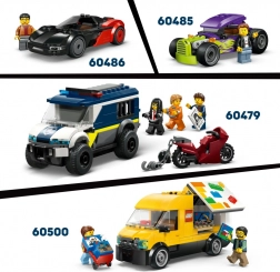 Model v červenej a čiernej farbe dopĺňa čierno‑biely kockovaný vzor po stranách a funkčné prvky na interaktívne hranie: odnímateľný kiosk pre jednoduchý prístup dovnútra, posuvné okienko na výdaj aj kapota s motorom pre extra detail. Nechýbajú 2 minifigúrky – predavač s čiapkou a zákazník – pripravené na nekonečnú porciu zábavy.