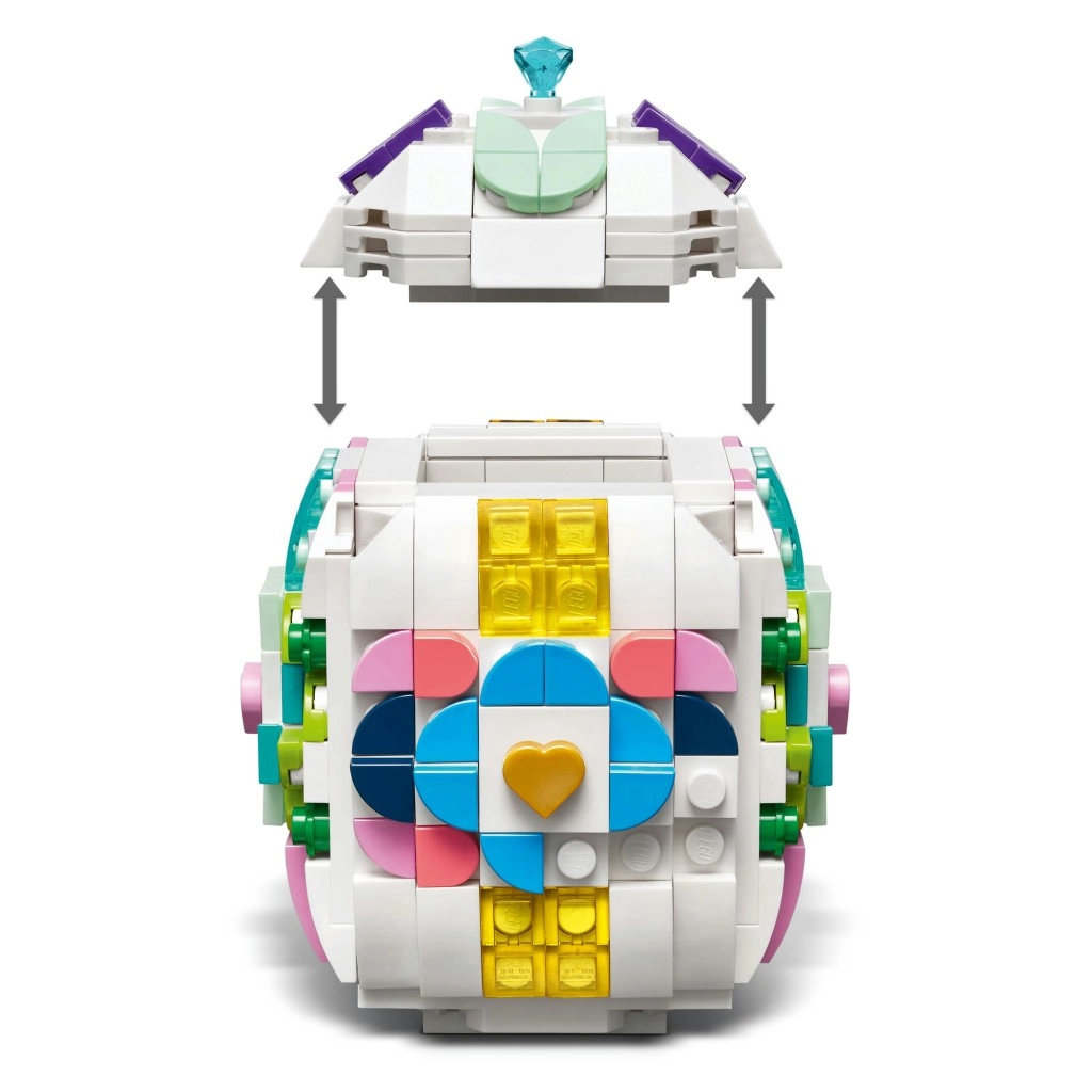 Toto elegantné biele vajíčko z kociek LEGO je vysoké približne 10 cm a široké 7,9 cm – ideálna veľkosť na poličku, stôl či veľkonočné aranžmány. Vďaka bohatej sade pastelových a transparentných dielikov (srdiečka, lístky, „diamanty“) si ľahko vytvoríte originálny vzor a kedykoľvek ho obmeníte.