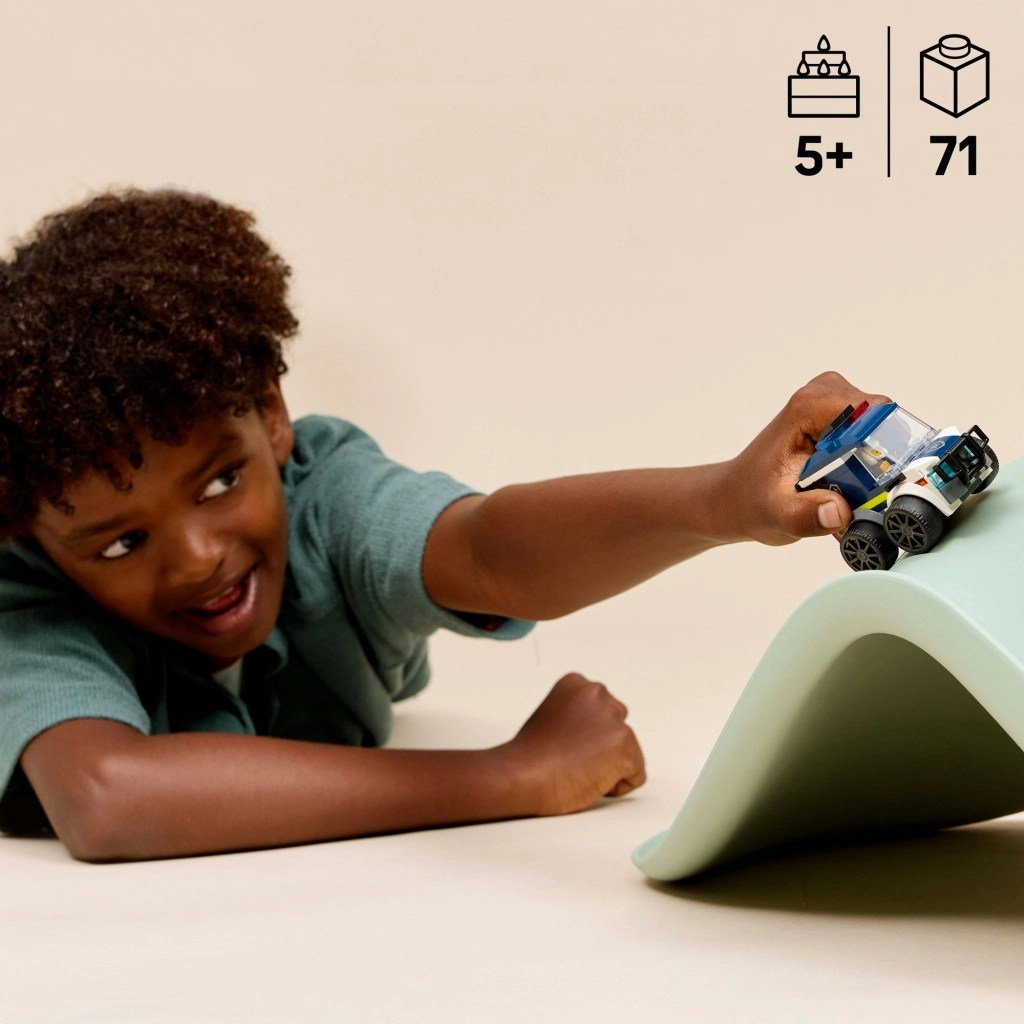 Rozbehnite príbehy z ulice s kompaktnou LEGO City policajnou dodávkou, ktorá sa ľahko stavia a vydrží aj intenzívne detské hranie. Štýlový dizajn s tmavomodrou karosériou, bielymi a žltými detailmi a výrazným policajným štítom zaujme na prvý pohľad. Odnímateľný strešný modul s červenými a modrými svetlami dodáva vozidlu skutočný služobný charakter.